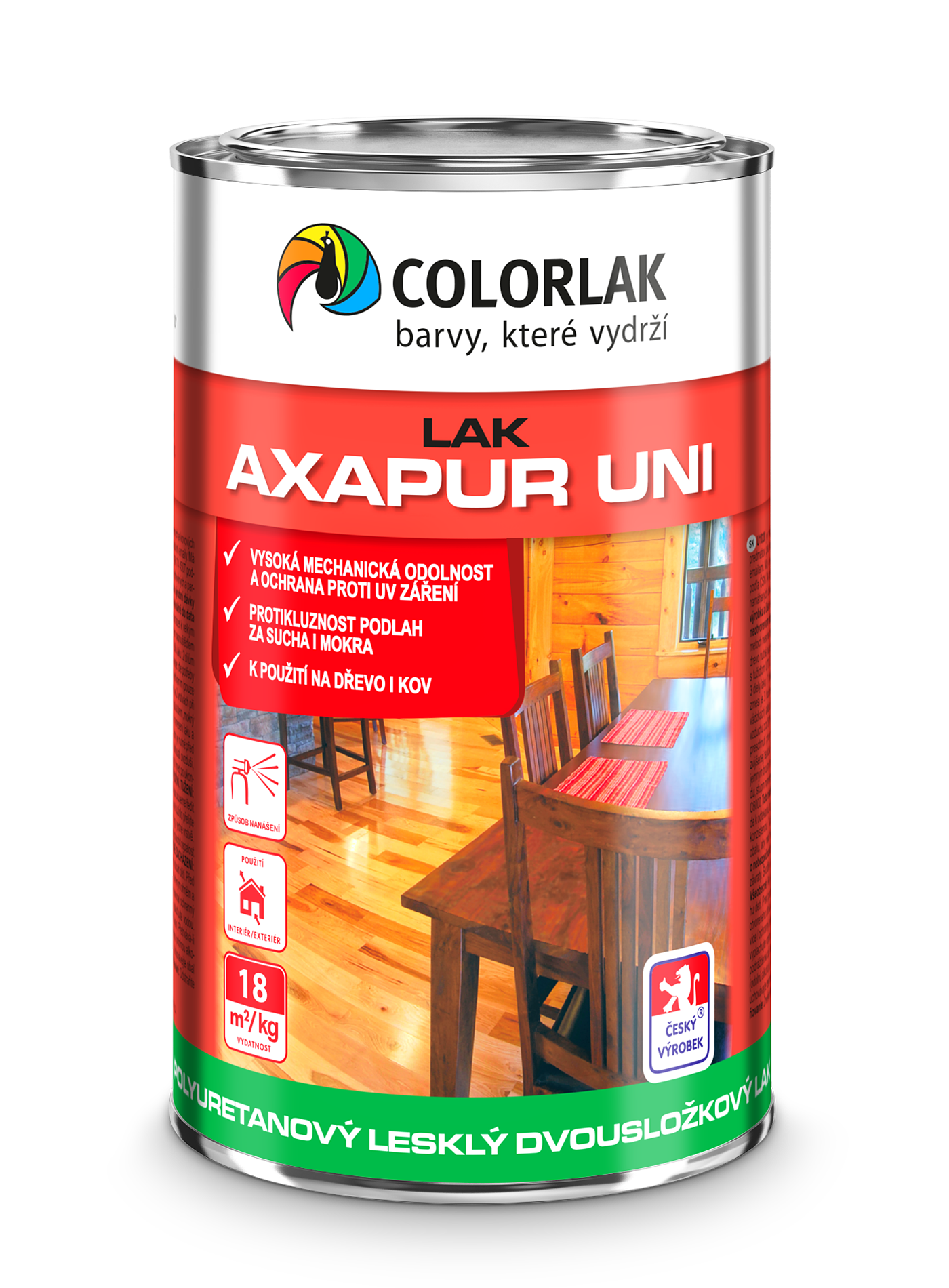 • Lak poskytuje nežltnúci, tvrdý, lesklý, veľmi odolný film, ktorý je vhodný na povrchovú úpravu namáhaných drevených a parketových podláh, schodov a schodíšť – atest na protišmykovosť za sucha aj mokra.