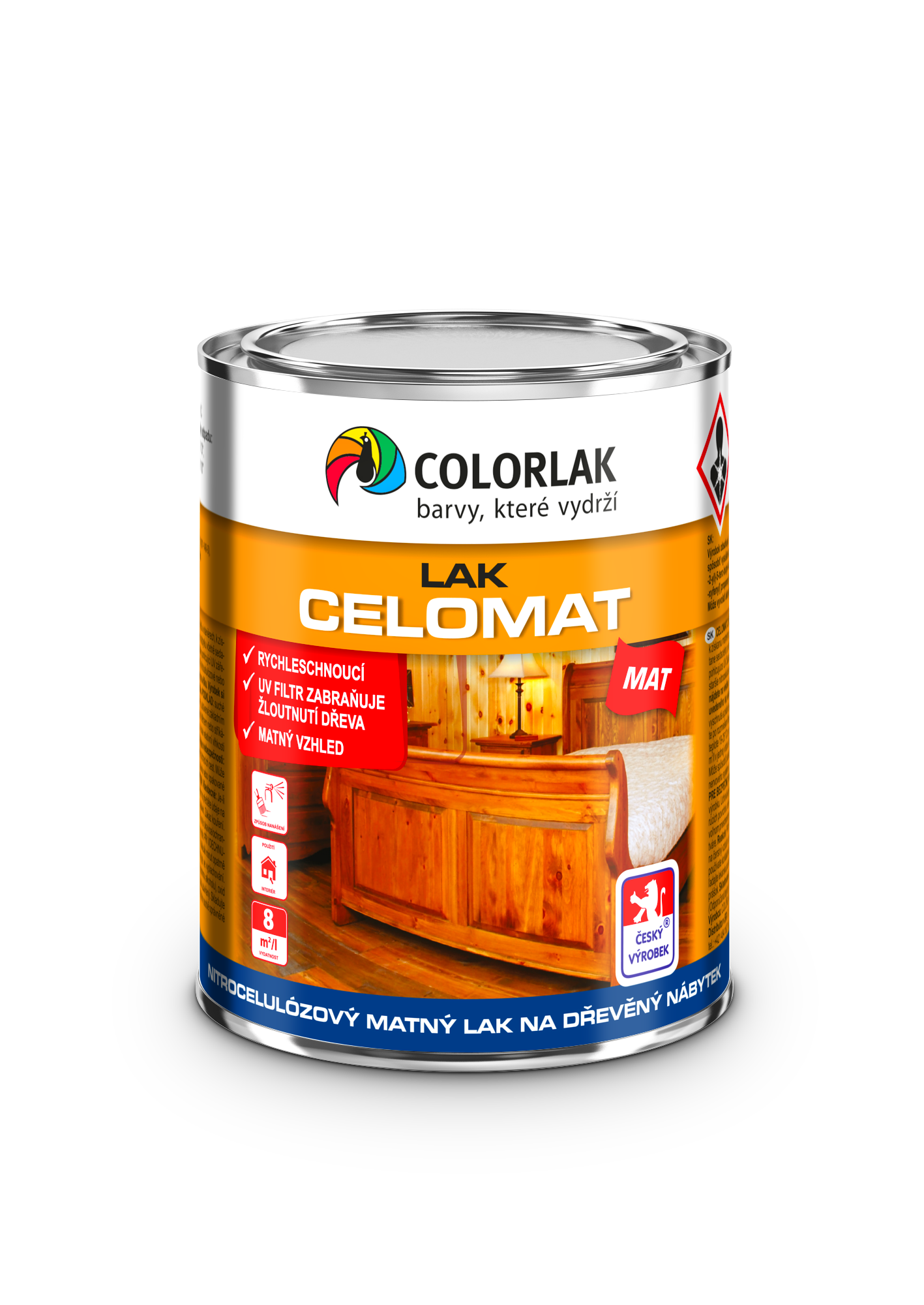 - Lak CELOMAT C1038 je určený na interiérové bezfarebné matné povrchové úpravy dreveného a prúteného nábytku (aj sedacieho) a všetkých ďalších drevených a korkových predmetov v interiéri aj na prelakovanie starších nitrocelulózových a akrylátových náterov, (okrem podlahových plôch).