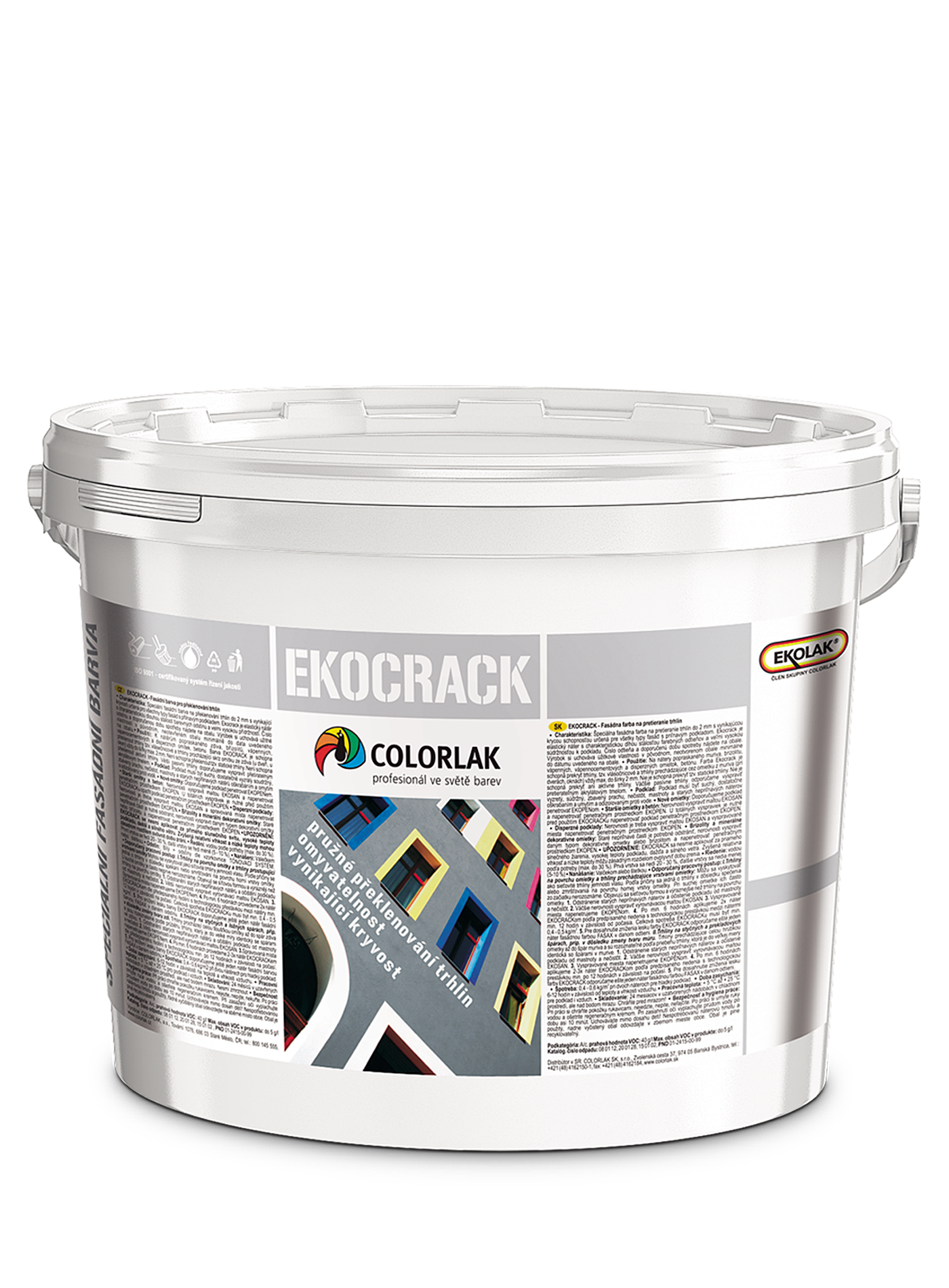 EKOCRACK je špeciálna fasádna farba na preklenovanie trhlín. EKOCRACK je disperzná špeciálka na preklenovanie trhlín do šířky 2 mm a je vhodná na všetky typy fasád s priľnavým povrchom, kde vytvára elastický náter s charakteristickou veľmi vysokou prídržnosťou na popraskanom murive, brizolite, vápenných, vápennocementových, disperzných a silikónových omietkach, betónu. EKOCRACK je schopný preklenúť tzv. vlásočnicové trhliny a trhliny prechádzajúce cez omietku z muriva (na dverách, na oknách) vždy do šírky max. 2 mm, ale nie je schopný preklenúť tzv. statické trhliny a aktívne trhliny. Väčšie pasívne trhliny odporúčame vyspraviť pretierateľným akrylátovým tmelom.