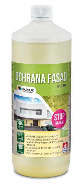 OCHRANA FASÁD V1930 je určený na dlhodobejšiu preventívnu ochranu pred biologickým napadntím (huby, baktérie, plesne, riasy a machy) na fasádach a ďalších minerálnych plochách v exteriéri, ako sú omietky, murivo, betón, kameň, strešné krytiny. V1930 je určený k priamemu použitiu, už sa neriedi ani inak neupravuje. OCHRANA FASÁD slúži ako posilnená a dlhodobejšia prevencia pri nových očistených plochách, v synergii na ČISTIČ FASÁD V1920 alebo nariedený ČISTIČ FASÁD KONCENTRÁT V1923, a ako priama prevencia pred možnou tvorbou rias, machov, húb, plesní a baktérií pri fasádach v problematických lokalitách napr. v blízkosti lesa, vodných plôch, mokradín, zatienených miest a pod. V1930 neobsahuje chlór, nezapácha a nehrozí nebezpečenstvo zmeny odtieňa fasády. Plochy opatrené OCHRANOU FASÁD nemôžu prísť do styku s potravinami, krmivami a pitnou vodou. Výrobok nemôže byť použitý na nátery detského nábytku a hračiek.
