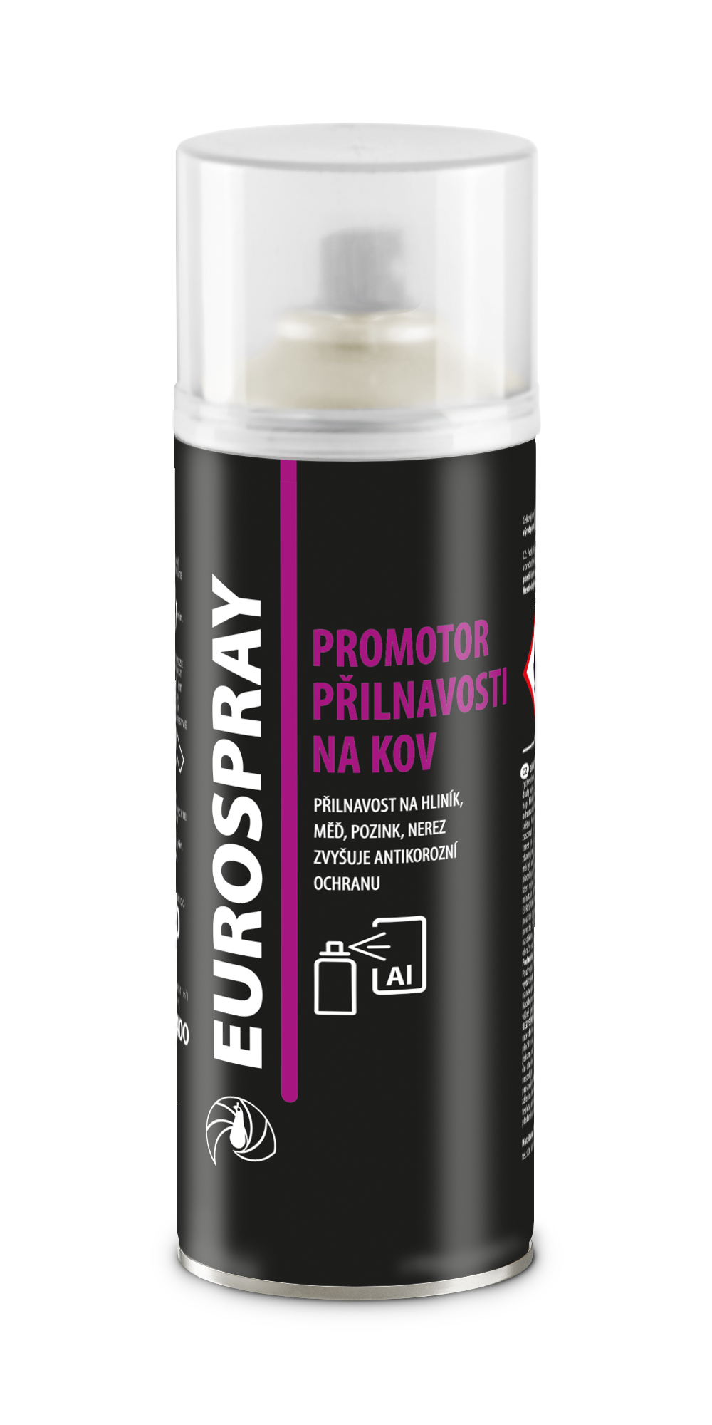 • EUROSPRAY PROMOTOR PRIĽNAVOSTI NA KOV je špeciálna bezfarebná rýchloschnúca adhézna/základná vrstva na zaistenie priľnavosti na všetky druhy kovov.
