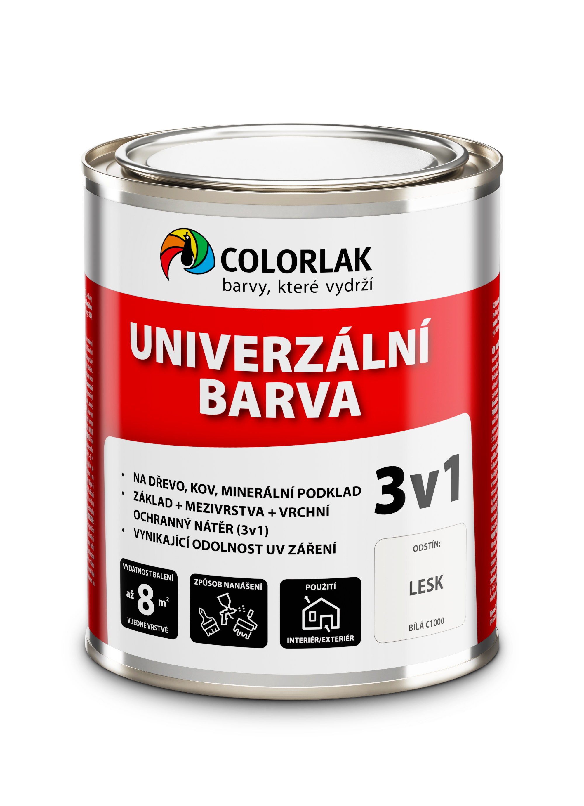 - Lesklá UNIVERZÁLNA FARBA 3v1 slúži ako jednovrstvová farba pre vonkajšie a vnútorné nátery na drevo, kov (mimo pozink a ľahkých kovov), ako sú napr. drevené okná, dvere, ploty, záhradný nábytok, chaty, záhradné stavby, rôzne kovové konštrukcie, oplotenie, vráta, odkvapy, parapety, zábradlia, zárubne a pod. Farba má vynikajúcu odolnosť voči poveternosti a vysoký lesk.